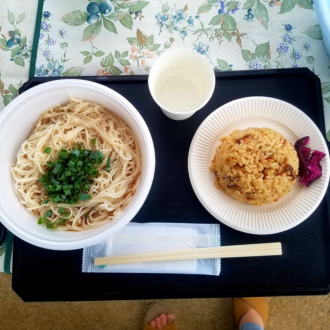 新鮮なネギたっぷりのお素麺、腰が強くて香川県民好みである。一緒についてきた炊き込みご飯も、甘辛くて美味しい。